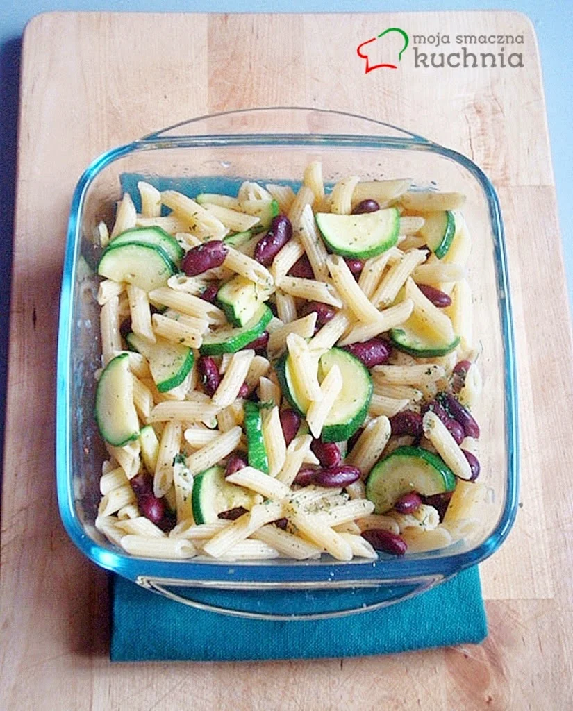 - Ugotowany i odcedzony makaron przekładamy na patelnię razem z cukinią i czosnkiem, dodajemy czerwoną fasolę i doprawiamy do smaku solą/pieprzem, mieszamy, po 2 minutach danie jest gotowe. Podajemy posypane posiekaną, suszoną natką z pietruszki.
